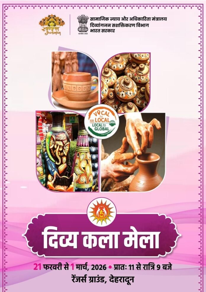 देहरादून – 21 फरवरी 2026 से 01 मार्च 2026 तक देहरादून के रेंजर्स ग्राउंड में दिव्यांगजन सशक्तिकरण विभाग, सामाजिक न्याय एवं अधिकारिता मंत्रालय, भारत सरकार द्वारा “दिव्य कला मेला” का आयोजन किया जा रहा है। इस मेले के आयोजन की नोडल एजेंसी राष्ट्रीय दिव्यांगजन वित्त एवं विकास निगम है।