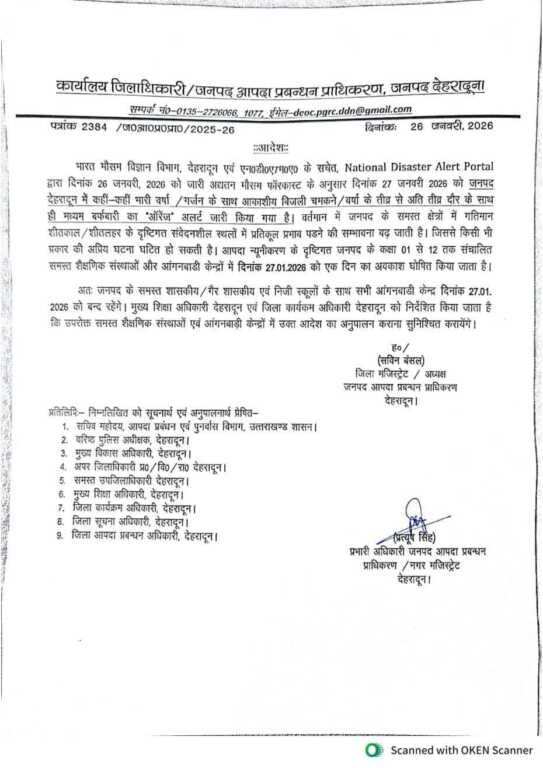 भारत मौसम विज्ञान विभाग, देहरादून एवं एन०डी०एम०ए० के सचेत, National Disaster Alert Portal द्वारा दिनांक 26 जनवरी, 2026 को जारी...